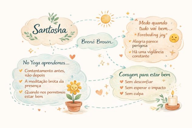 Brené Brown nomeia esse padrão como foreboding joy — o medo antecipado da perda quando algo bom acontece. No caminho do yoga, reconhecer esse funcionamento da mente faz parte do processo meditativo. Enquanto houver vigilância excessiva, não há repouso real. Quando a mente se antecipa, a presença se fragmenta.