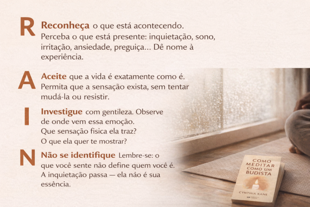 Essas atitudes, tão presentes na prática corporal, dialogam profundamente com o método RAIN, utilizado na meditação como um apoio à consciência e à autocompaixão. Mais do que uma técnica, o RAIN aponta para uma forma de estar: reconhecer, aceitar, investigar e lembrar que a experiência é transitória. No yoga, isso acontece muitas vezes sem nome — no momento em que respeitamos um limite, quando deixamos de brigar com o corpo, quando escutamos o que uma sensação quer mostrar e seguimos respirando.